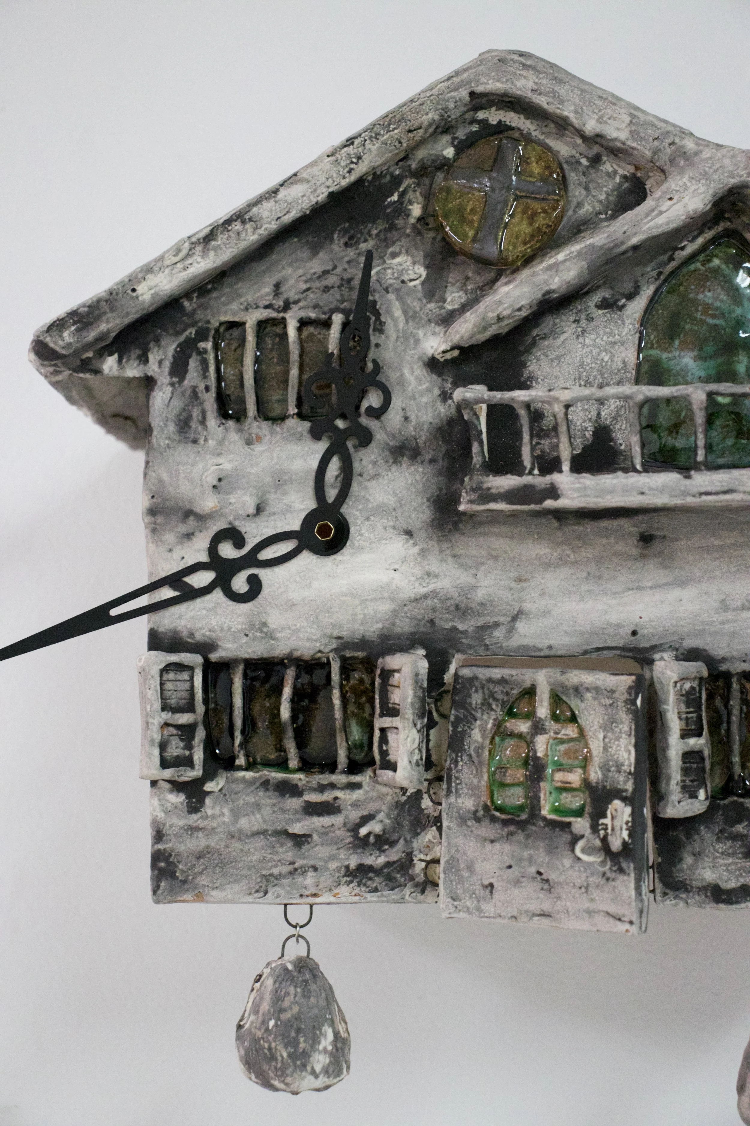 A close-up of a decorative cuckoo clock with an aged, weathered appearance, featuring stained-glass windows and a hanging weight in the shape of a stone or rock.