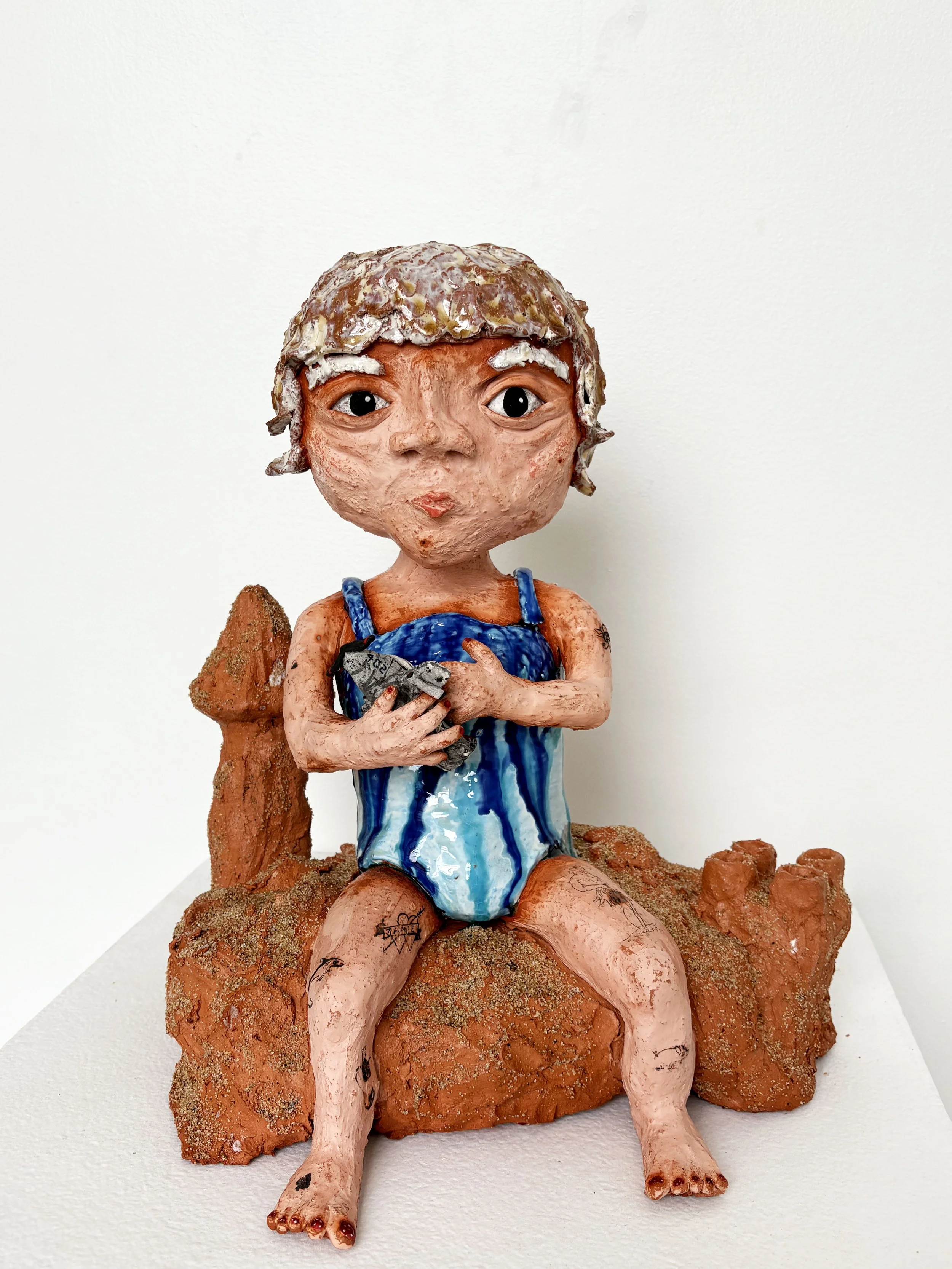 A ceramic sculpture of a young girl with large eyes, sitting on sand castle, holding a toy navy plane, wearing a blue swimsuit, with textured brown hair and a neutral expression.