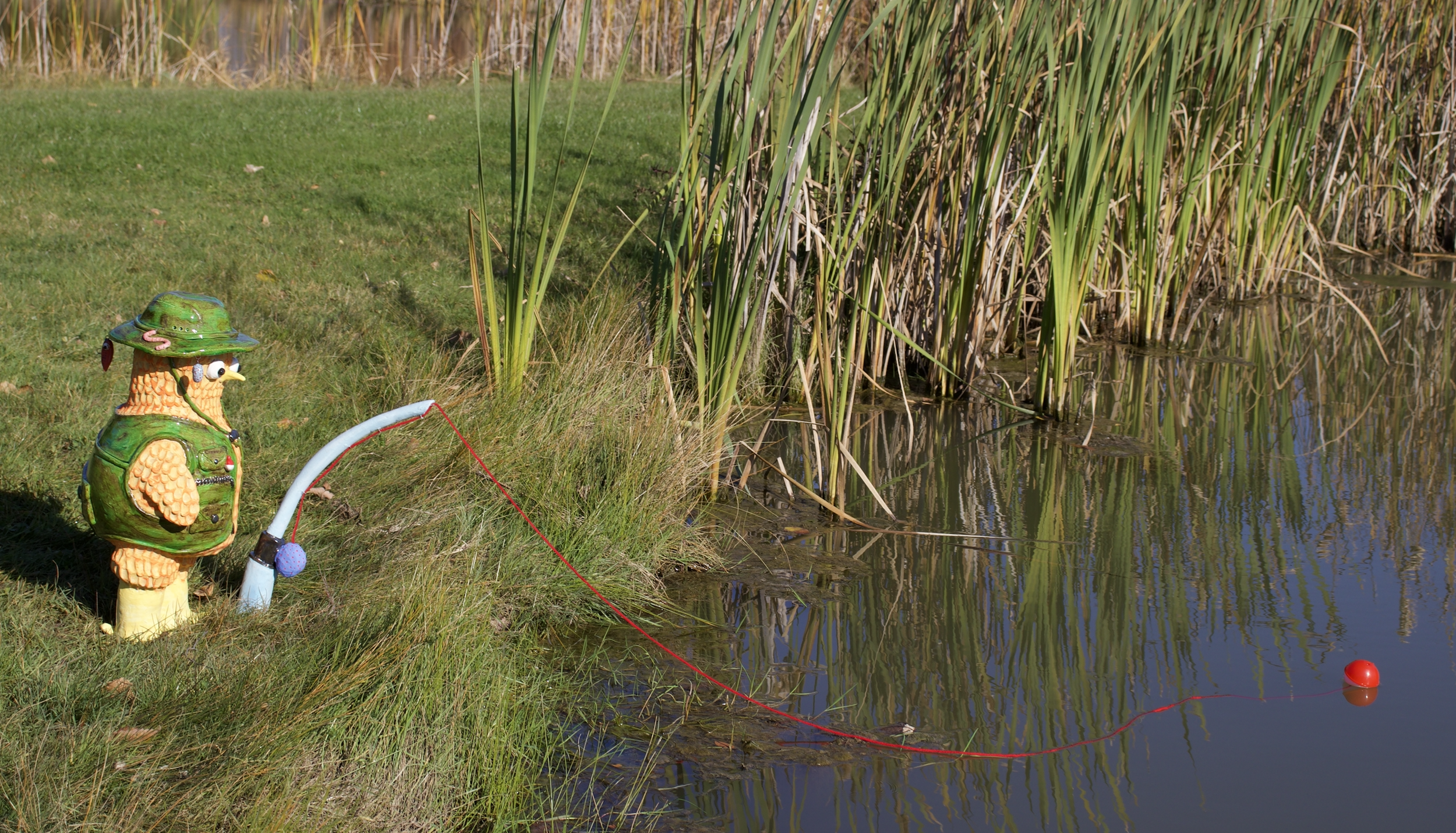 A colorful fisherman chicken wearing a green hat and vest, fishing by a pond with tall grasses and reeds, holding a fishing rod with a red bobber floating on the water.