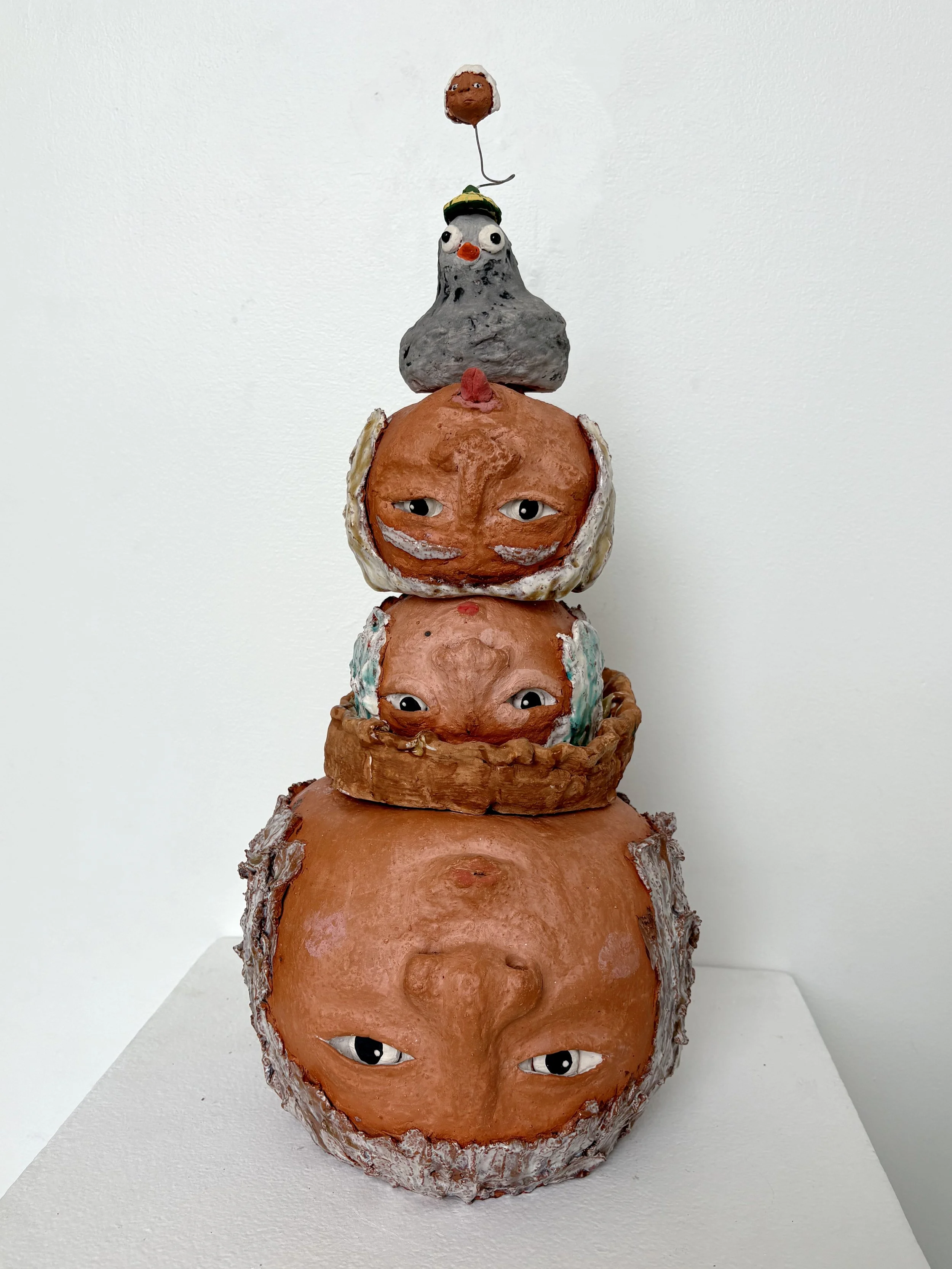 A sculpture made of stacked faces and heads, with various textured surfaces, topped with a small bird.