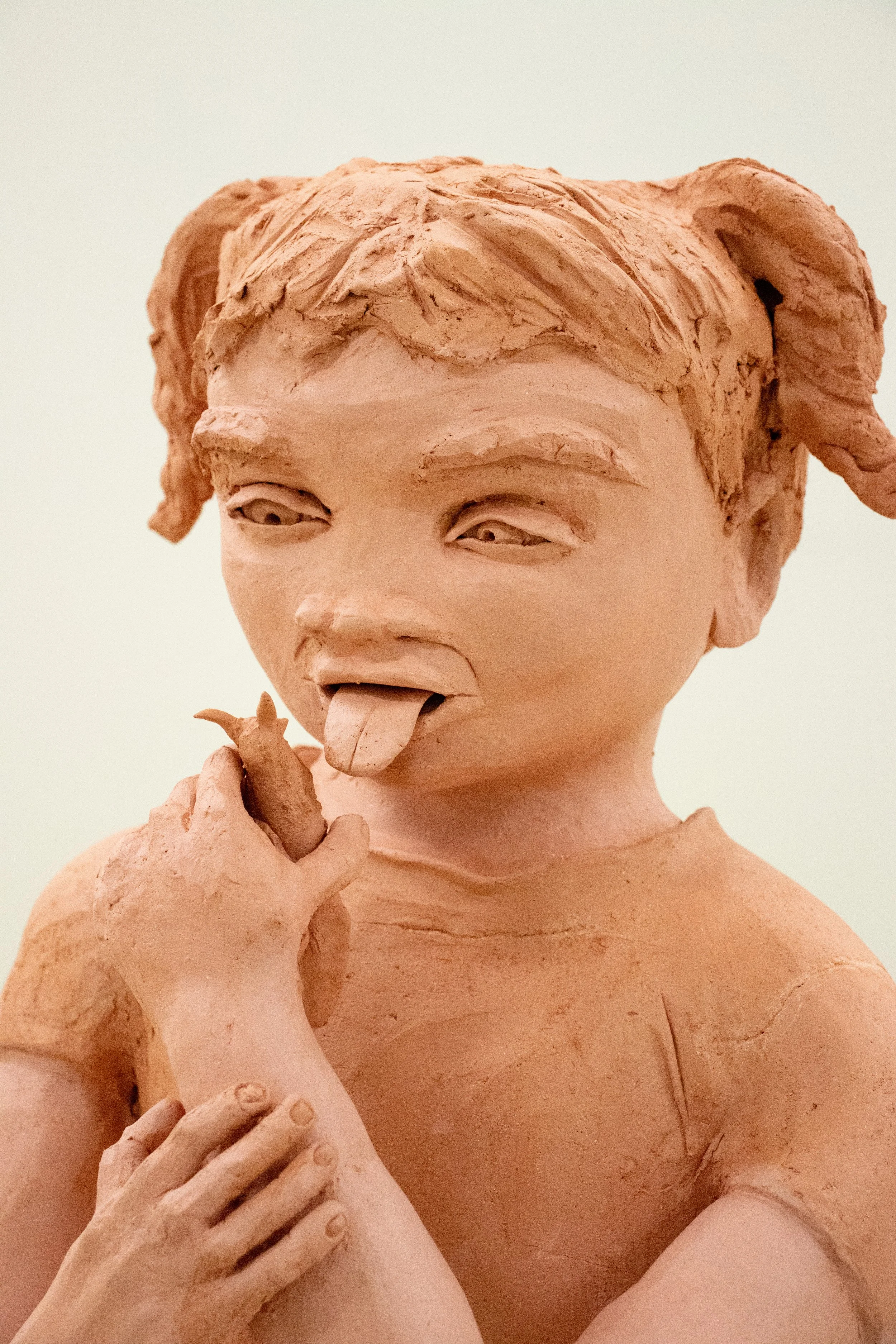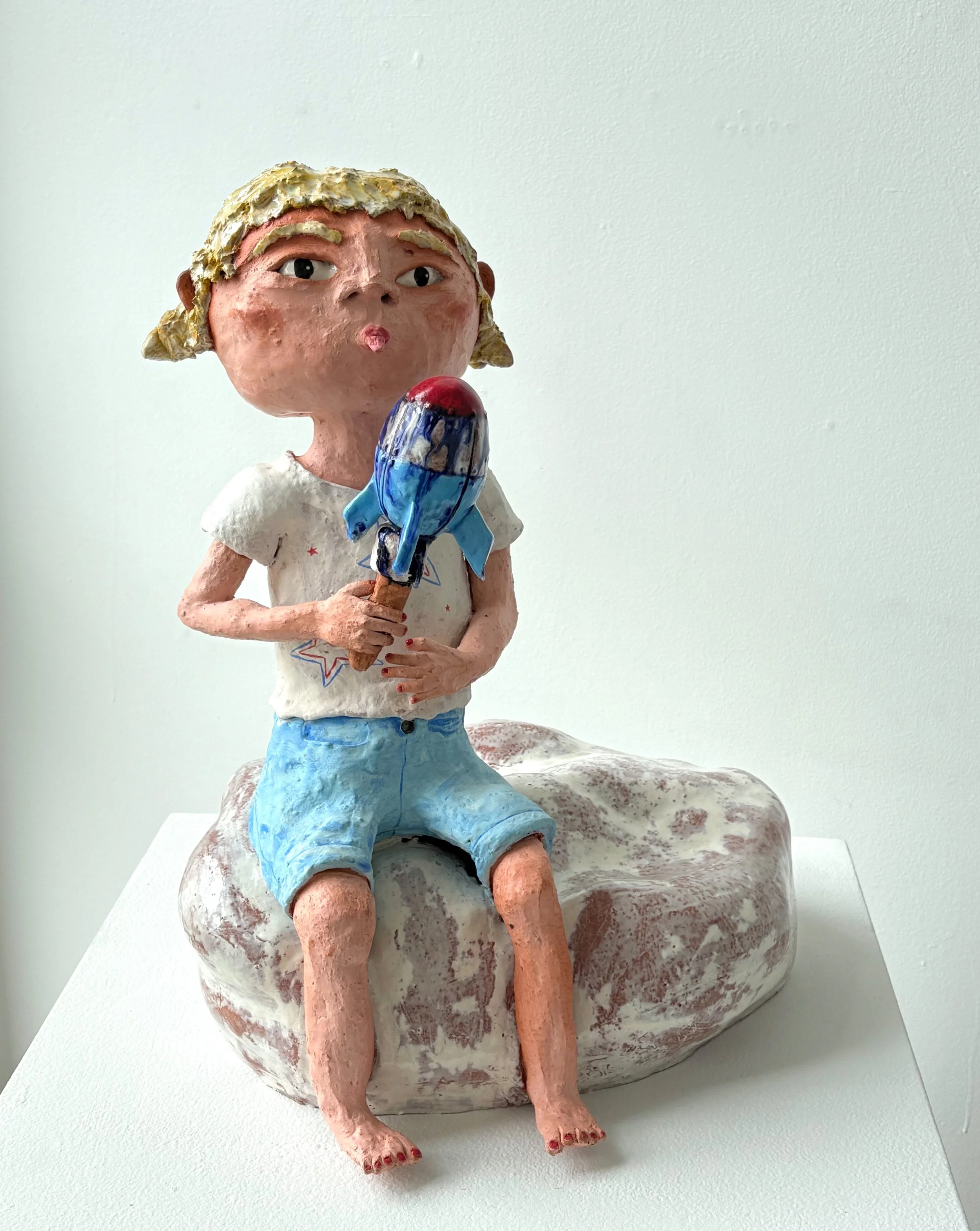 Clay sculpture of a girl sitting on a rock, holding an ice pop, with blonde hair, wearing a white t-shirt with stars and blue shorts.
