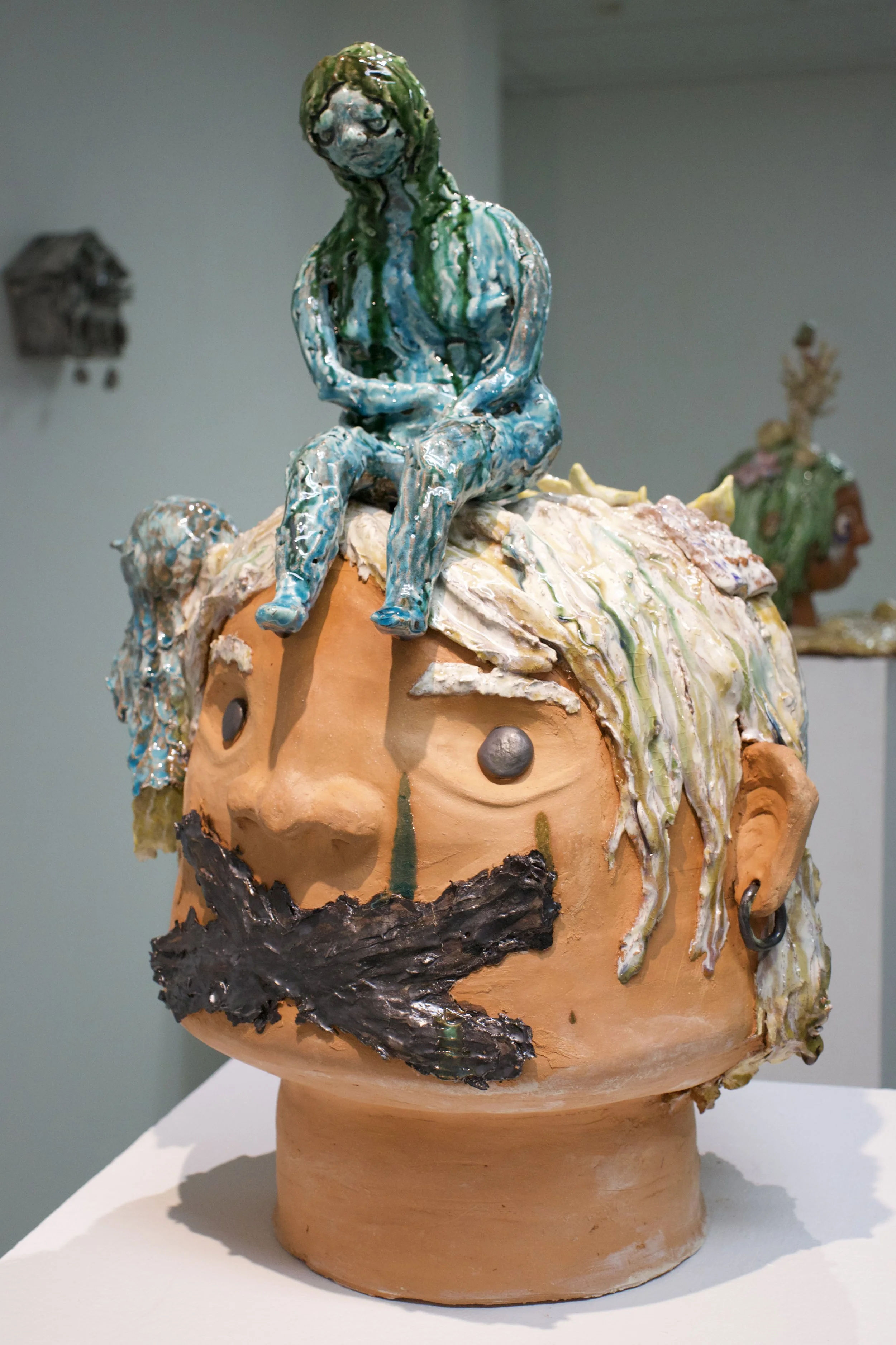 Ceramic sculpture of a large head with exaggerated facial features and a bonded mouth, with a small seated figure on top, detailed with colorful glaze and textured surfaces.